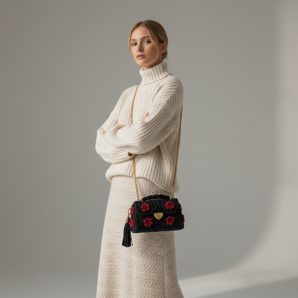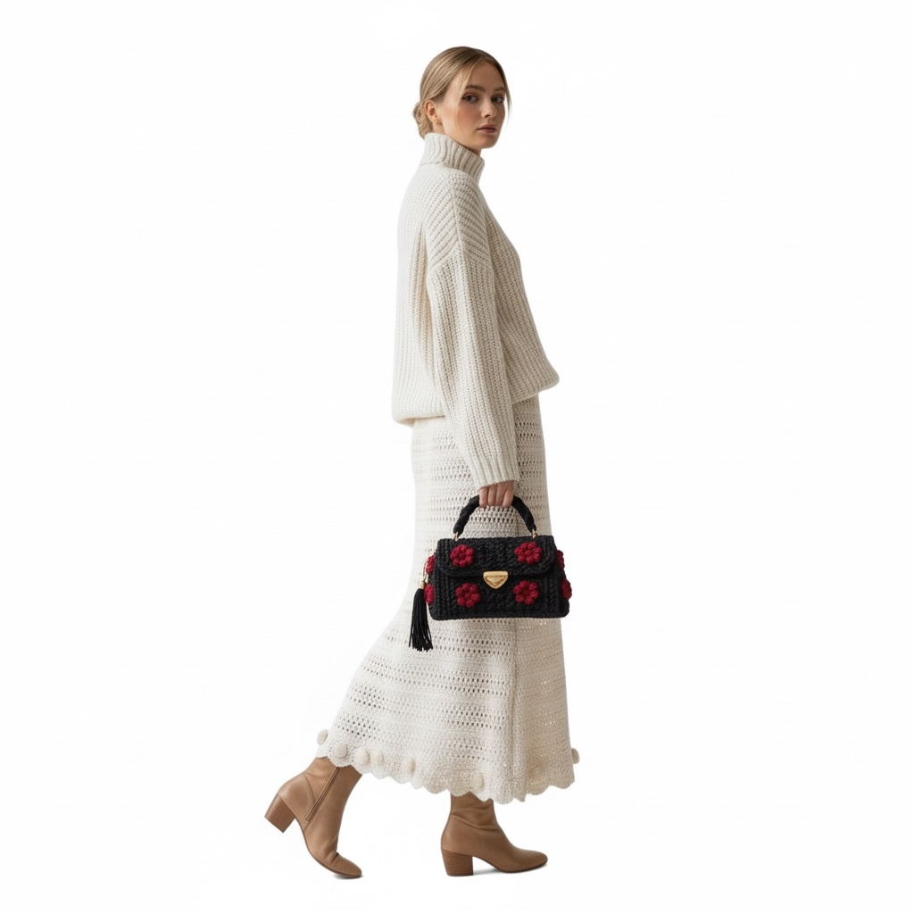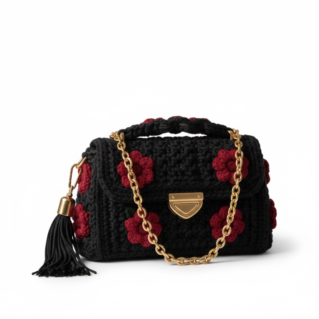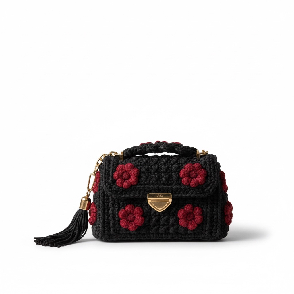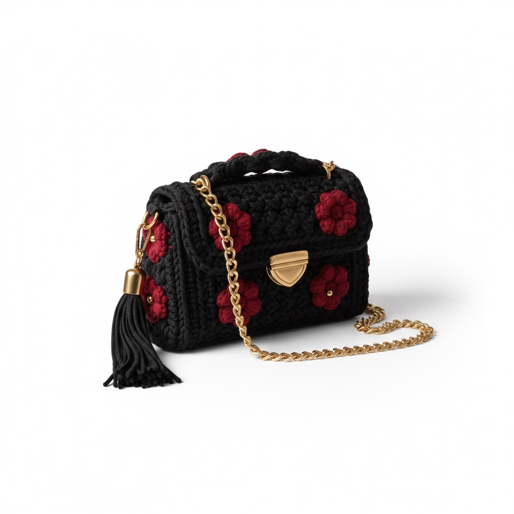 Crafted from premium cotton yarn in deep black and decorated with rich bordeaux crochet flowers, this bag blends elegance with bold personality. The gold-tone clasp and details add a luxurious touch, making it perfect for both everyday wear and special occasions.