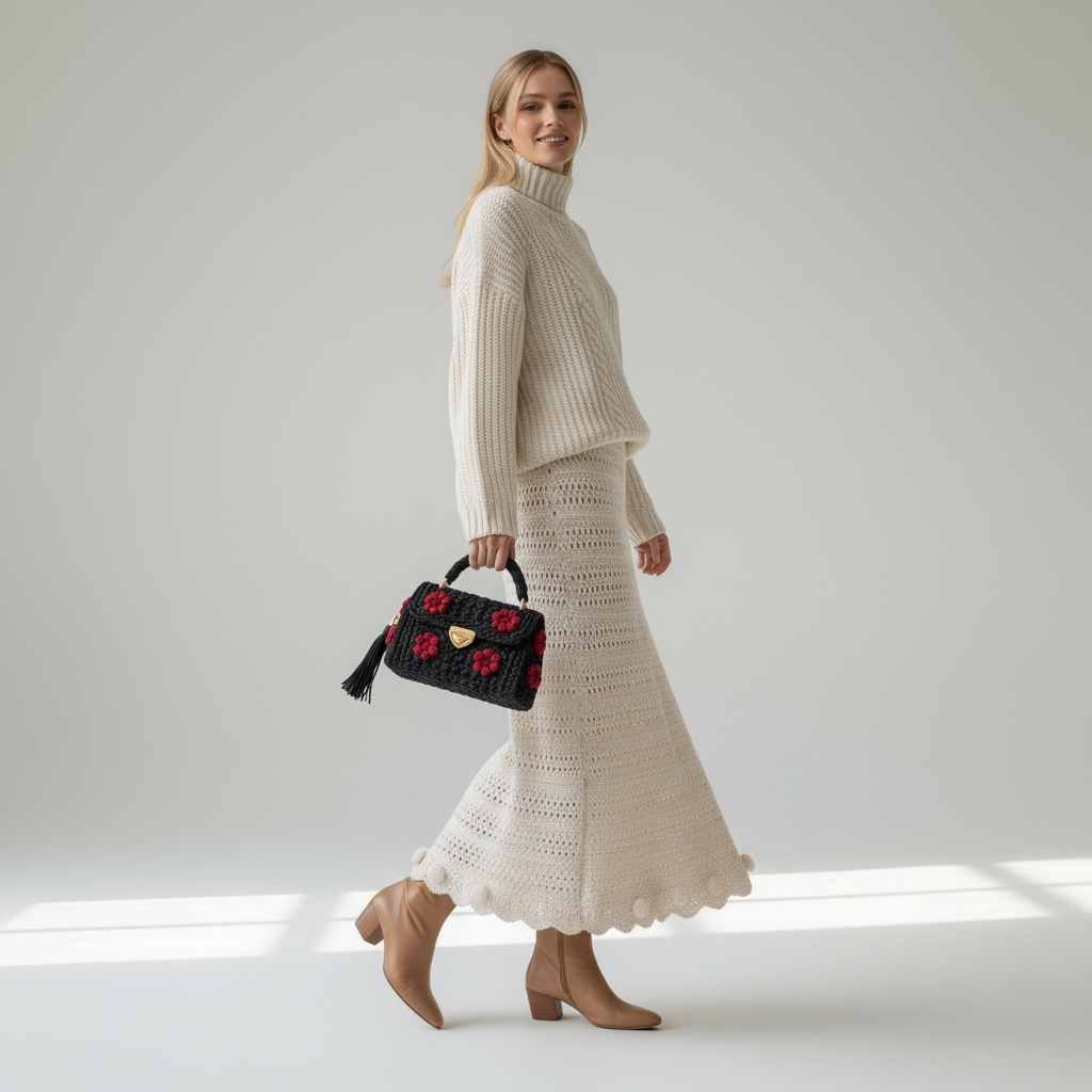 The Bordeaux Bloom Crochet Bag is a handmade statement piece designed for women who love unique, artistic accessories.