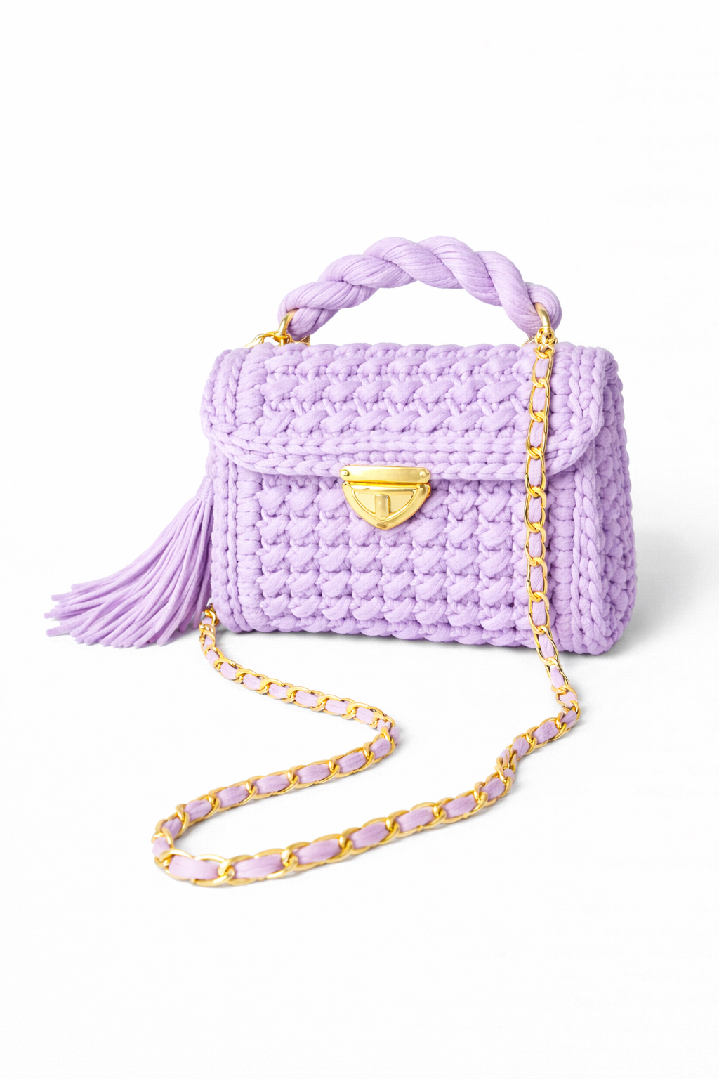 Its gentle lavender color, gold-tone metal clasp, and matching chain strap make it perfect for both daytime looks and special occasions. The structured shape keeps your essentials secure while maintaining a lightweight and comfortable feel. Each bag is handmade with attention to detail, making every piece truly unique.
