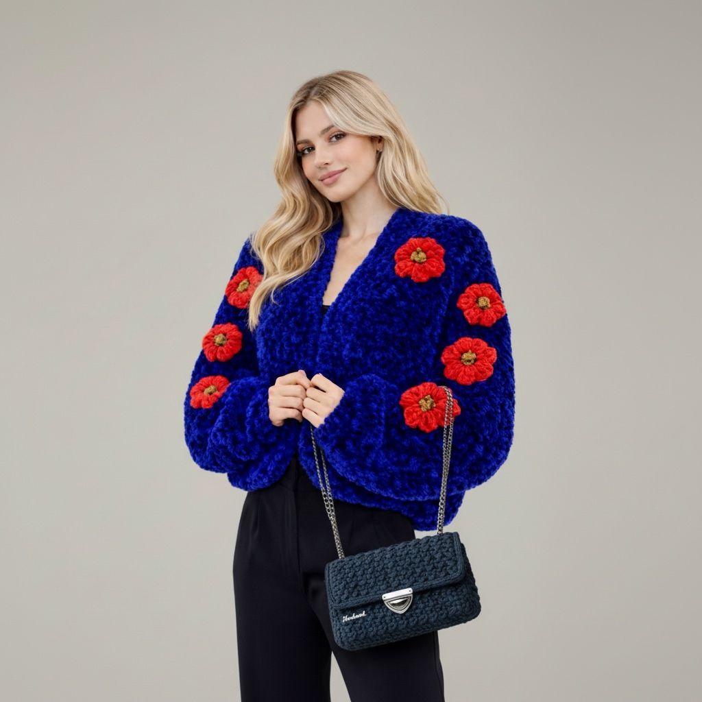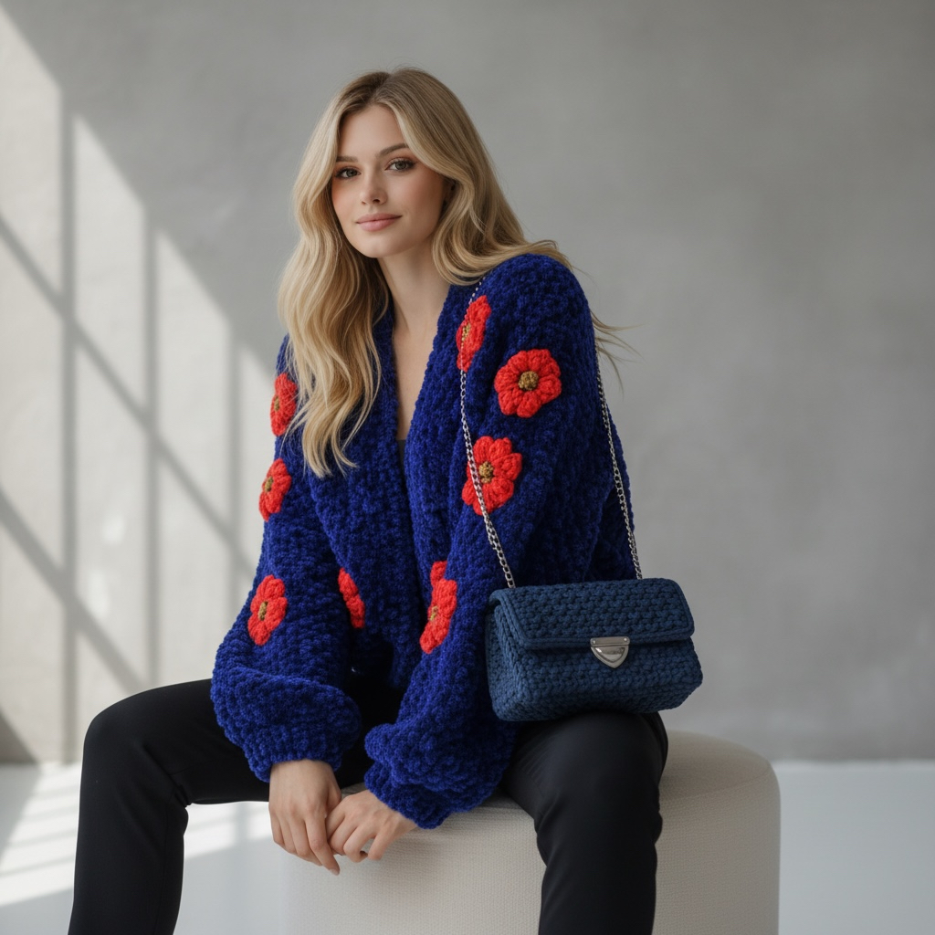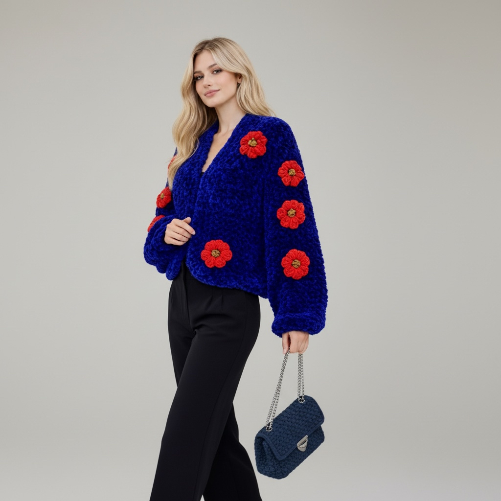 Make a bold statement with the Royal Bloom Velvet Cardigan – a luxurious handmade piece designed to turn heads. Crafted from ultra-soft velvet plush yarn, this cardigan combines comfort, warmth, and standout style.