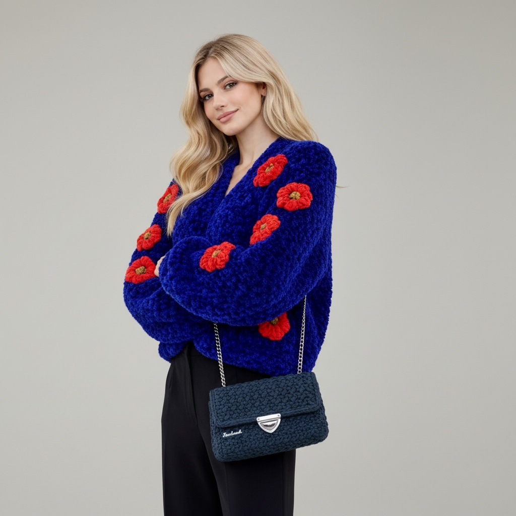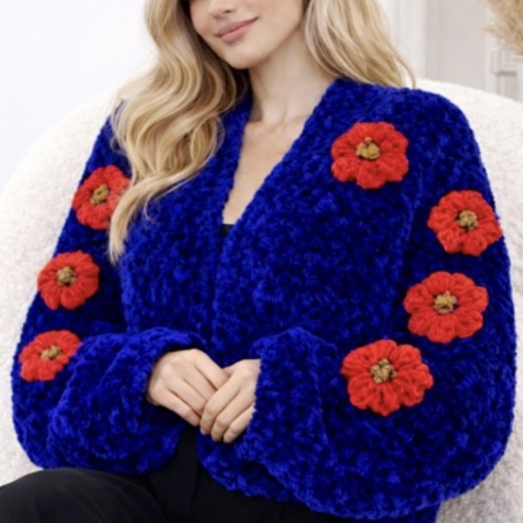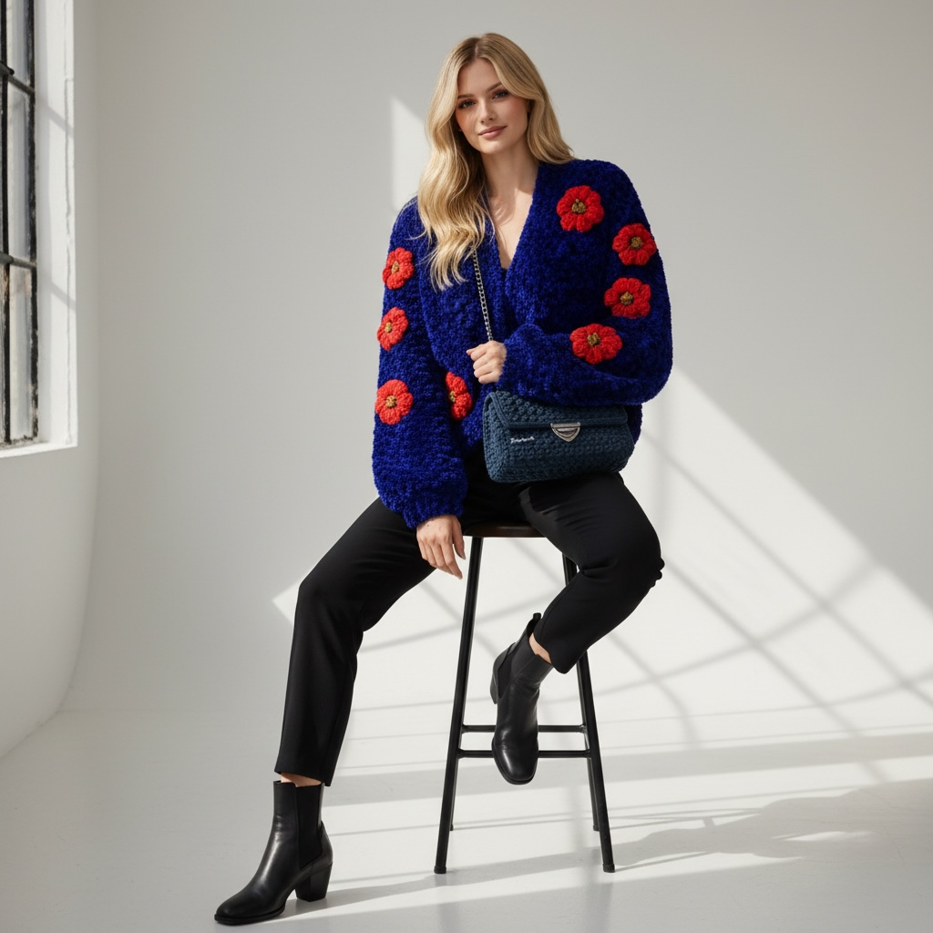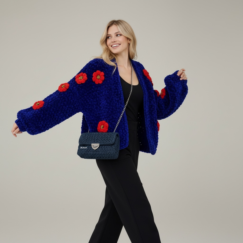 Make a bold statement with the Royal Bloom Velvet Cardigan – a luxurious handmade piece designed to turn heads. Crafted from ultra-soft velvet plush yarn, this cardigan combines comfort, warmth, and standout style.